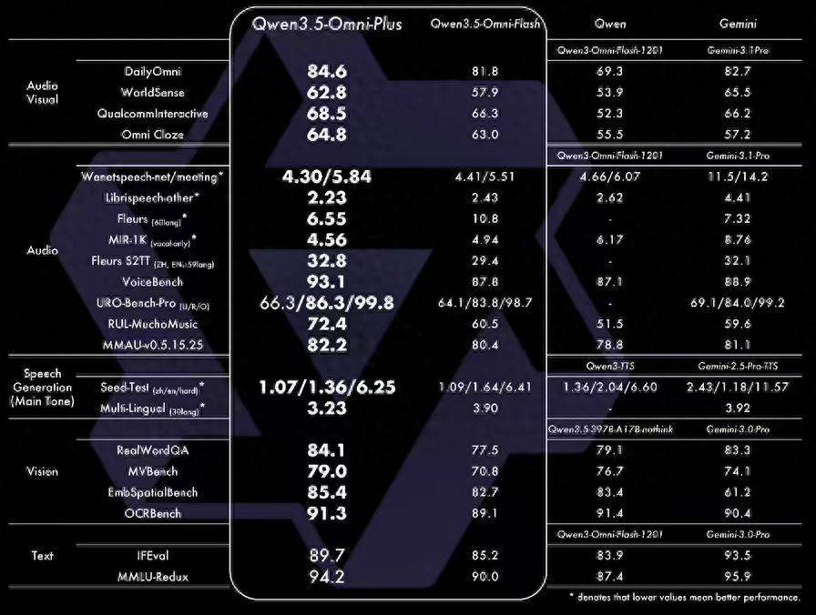 3月30日,阿里发布千问新一代全模态大模型Qwen3.5-Omni,在音视频理解、识别、交互等215项任务中取得SOTA(性能最佳),超越Gemini-3.1 Pro,成为目前全球最强的全模态大模型之一。新模型拥有极强的音视频理解与实时交互能力,能够对音视频内容生成详细且可控的结构化描述,可识别语言和方言数量多达113种,还惊喜地涌现出了音视频Vibe Coding能力。