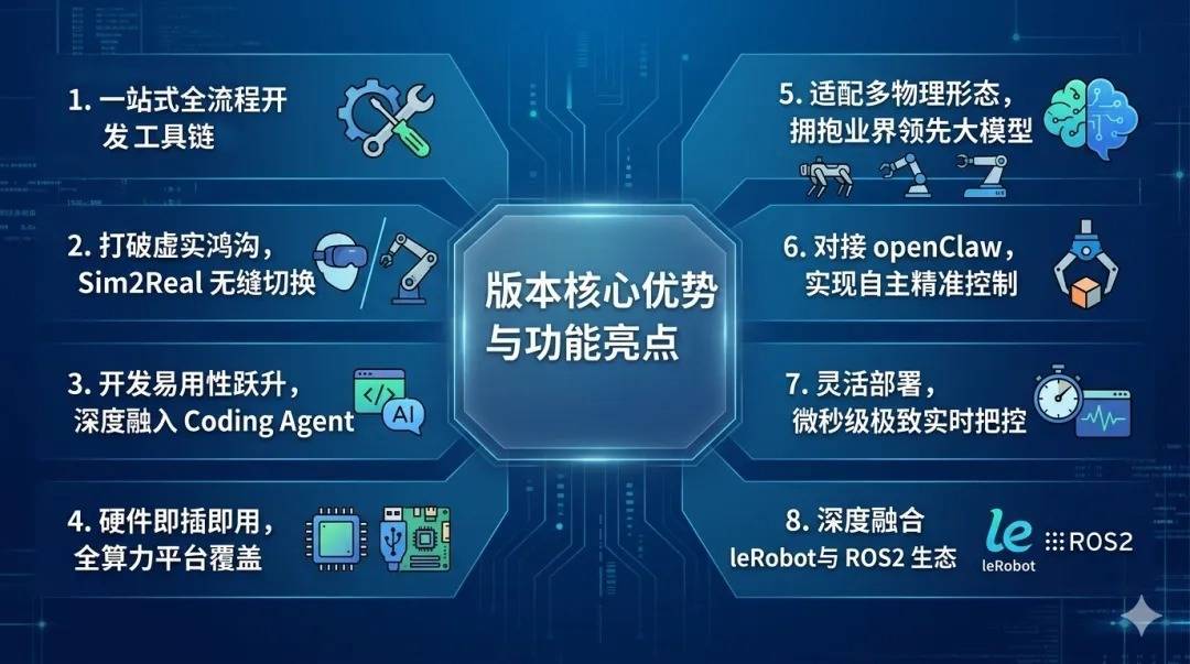 为大幅降低具身智能的开发门槛,新版本提供了一站式全流程工具链,全面覆盖环境搭建、仿真调试、数据录制、一键部署以及可视化运维,让开发者能够专注于算法创新与业务逻辑。